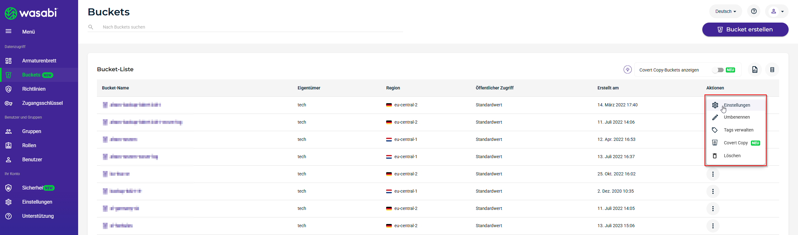 EL storage: Bucket-Eigenschaften in der Wasabi Console ändern