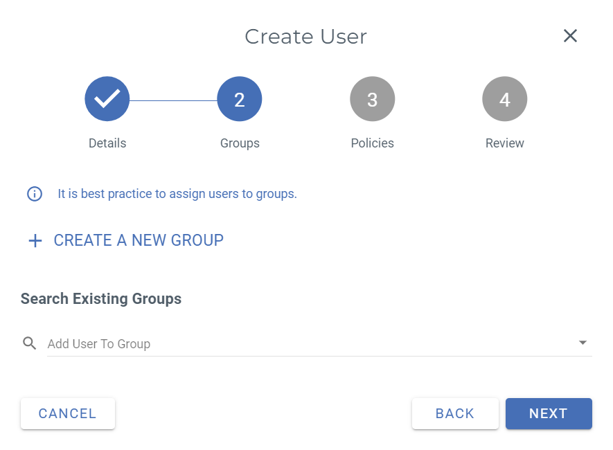 Under "Groups" you can assign the user directly to a group. This is optional and does not have to be filled in. The user can receive a policy directly from a group, for example.