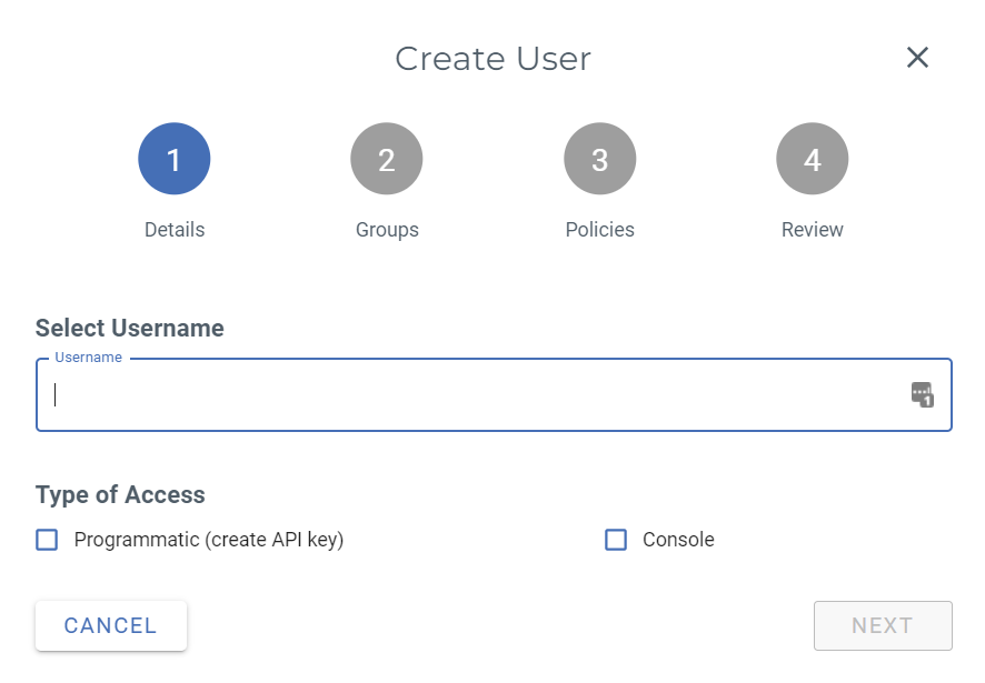Here you can now create a new user via the "Create user" button. In the following window, you have to give the user a name and decide whether he should have access to the web console or only be allowed to access the storage using software. If you have checked "Console", you must assign a password to the user.