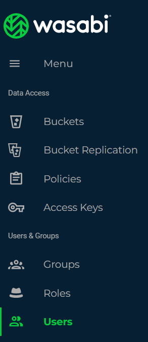 To begin, you will need to log in to the Wasabi Web Console with your root account. Then navigate to the "Users" tab in the left navigation bar.