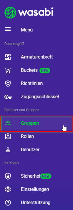 - Klicken Sie dazu bitte im Wasabi-Menü auf der linken Seite des Bildschirms auf “Gruppen”.