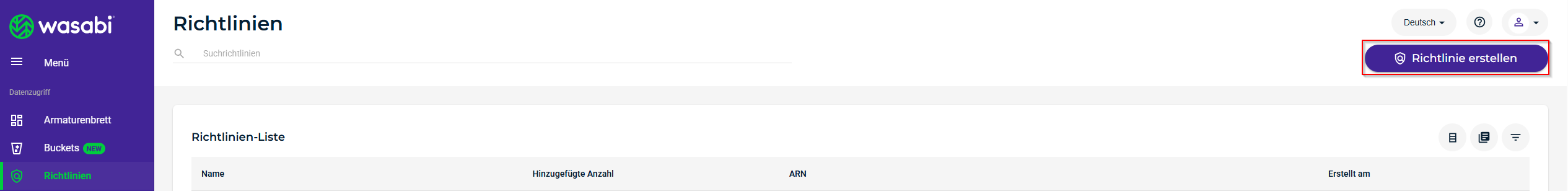 Navigieren Sie dort im Linken-Menüband zu dem Reiter "Richtlinien" und wählen Sie "RICHTLINIE ERSTELLEN".