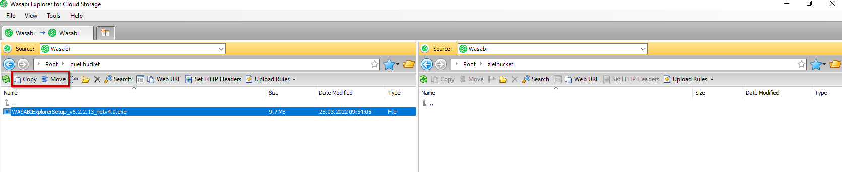 Nun können Sie in der linken Spalte Ihren Quell-Bucket öffnen und in der rechten Spalte den Ziel-Bucket. Über "Copy" oder "Move" können Sie die Dateien vom einen in den anderen Bucket kopieren oder verschieben.