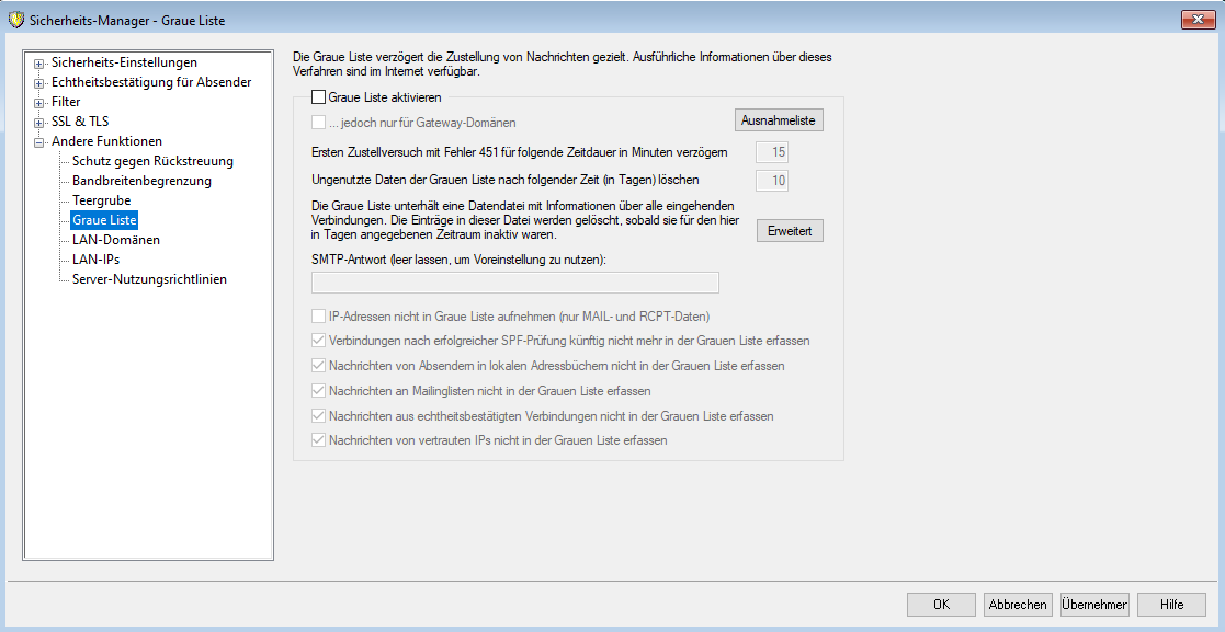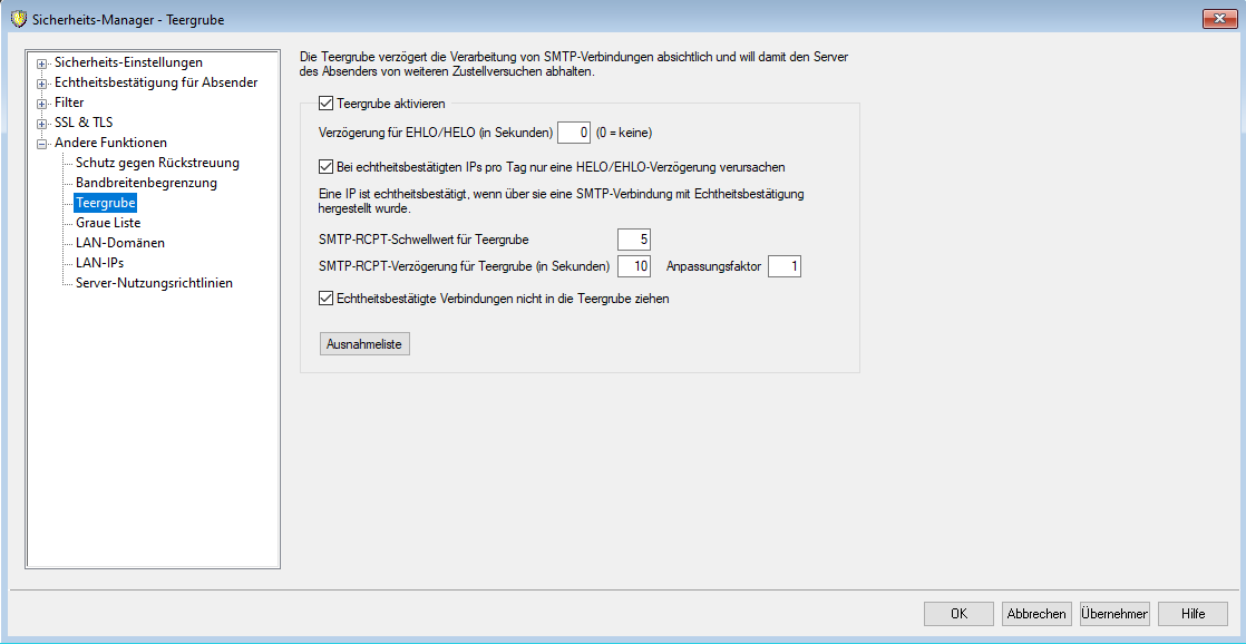 Ausnahmeliste für STARTTLS, Hosts/IPs, die in dieser Liste hinzugefügt werden, werden von der STARTTLS-Prüfung während einer SMTP-Sitzung ausgeschlossen.