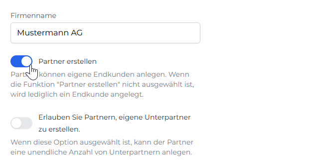 Mit der Funktion "Partner erstellen" haben Sie die Möglichkeit, Partner anzulegen, welche eigene Endkunden oder Unterpartner anlegen können:
