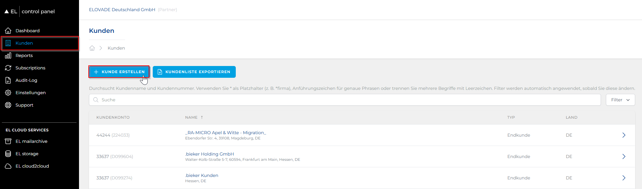 Um im Control Panel einen Kunden zu erstellen, klicken Sie bitte unter dem Reiter "Kunden" auf "Kunde erstellen":