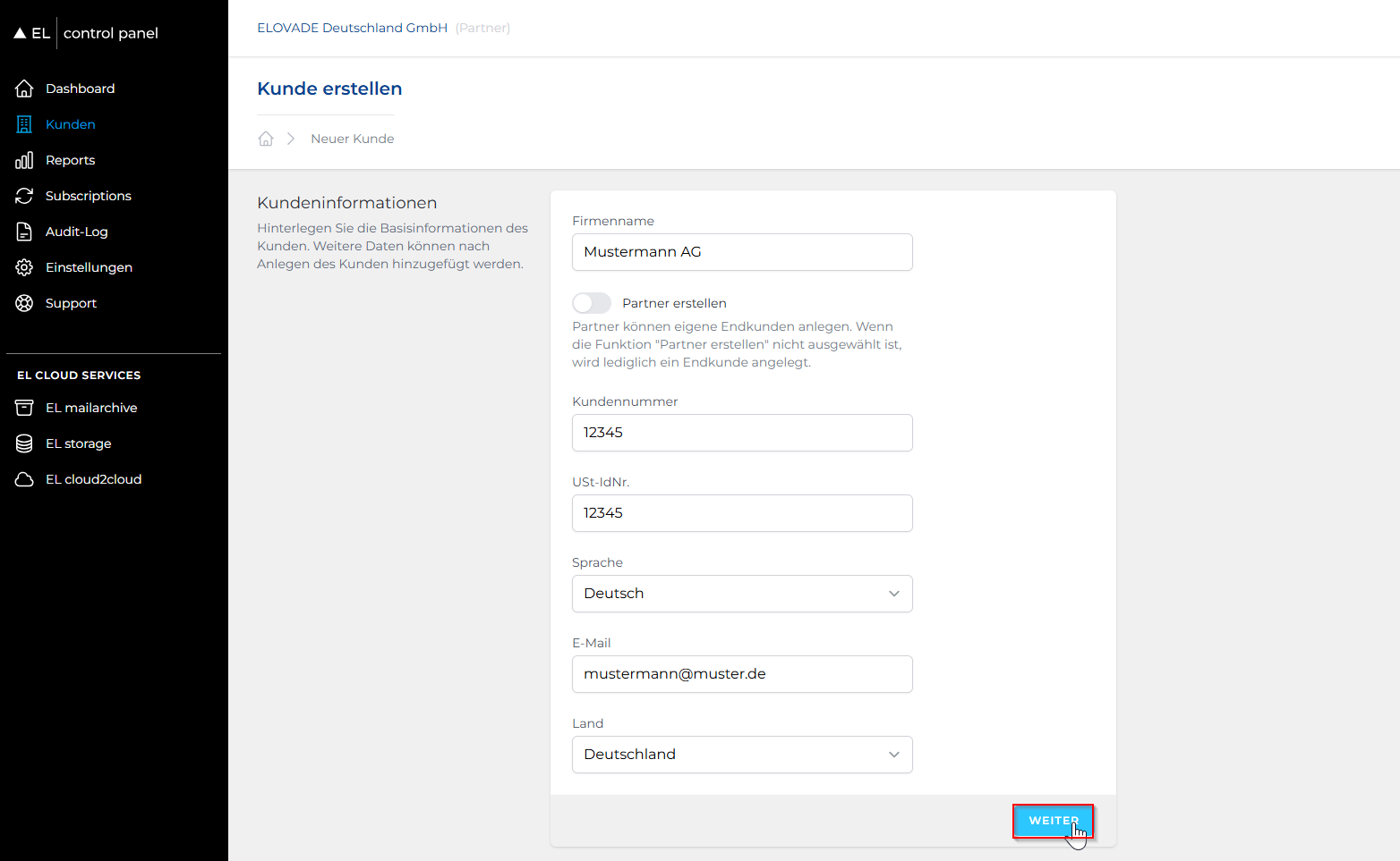Vervollständigen Sie die Kundendaten und klicken Sie anschließend auf "Weiter":