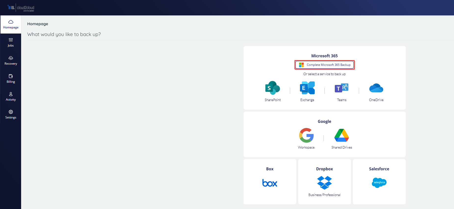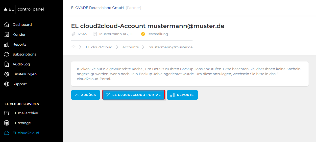 Um im nächsten Schritt ein Complete Microsoft 365 Backup zu erstellen, klicken Sie auf "EL cloud2cloud-Portal":