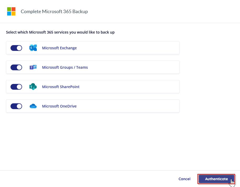 Klicken Sie anschließend auf "Complete Microsoft 365 Backup":