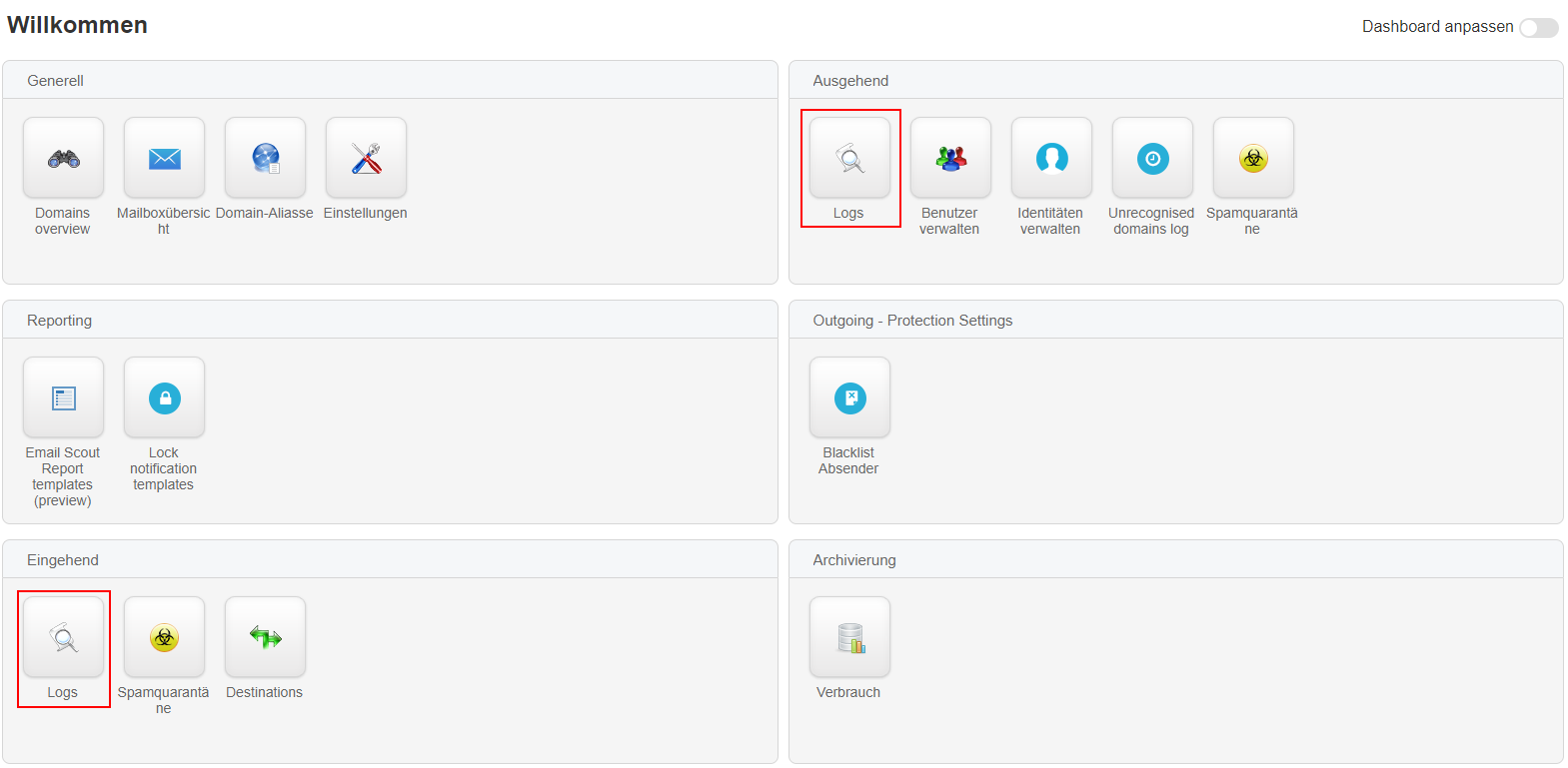Generell gibt es zwei Arten von Scout Reports, je einen für den eingehenden sowie den ausgehenden Verkehr. Wir zeigen Ihnen hier beispielhaft, wie ein Scout Report für den eingehenden E-Mail-Verkehr erstellt wird. Dafür öffnen Sie die globale Übersicht und gehen in der Kategorie "Eingehend" auf "Logs".