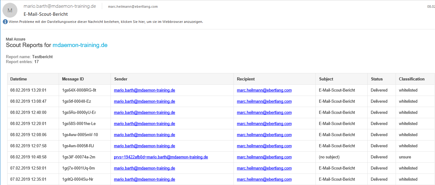 Nachfolgend Sehen Sie einen verschickten E-Mail Scout Report, welcher in Outlook 2019 geöffnet wurde: