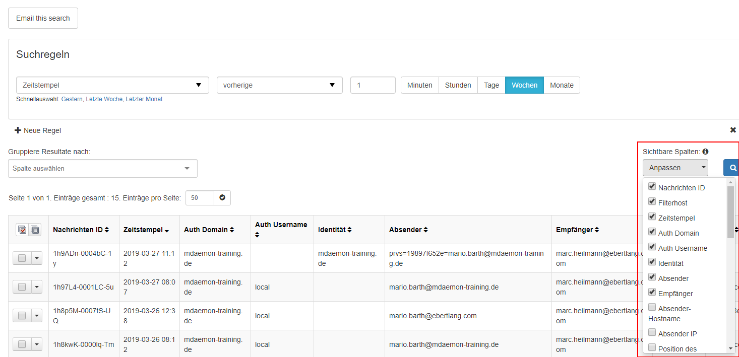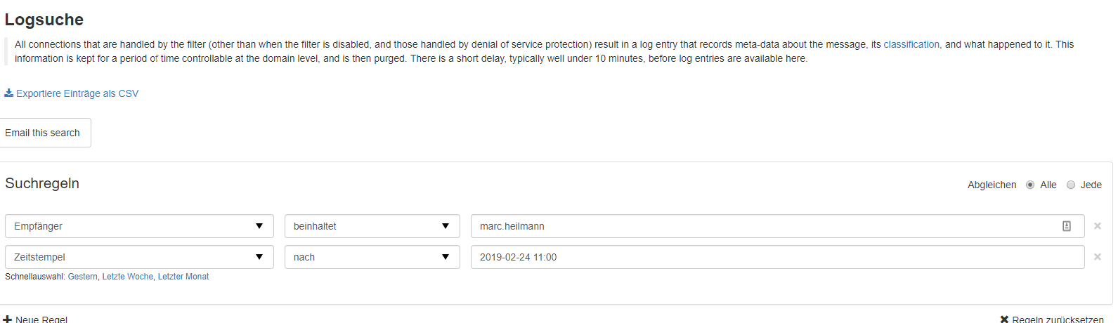 Im oberen Bildschirmbereich finden Sie die Suchregeln. Hier können Sie anpassen welche Art von E-Mails in dem Report angezeigt werden.