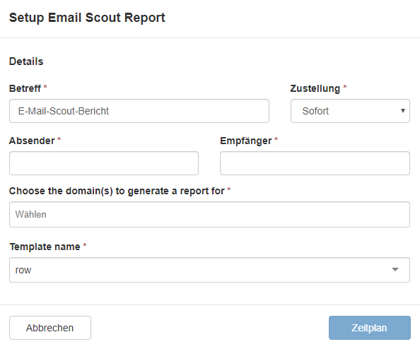 Hier werden der Betreff, Absender, Empfänger, die für den Report bestimmten Domänen, das Template und die Zustellung ausgewählt. Bei dem Punkt "Choose the domain(s) to generate a report for" wählen Sie die Domänen aus, auf die der E-Mail Scout Report angewendet werden soll. Bei dem Template können Sie entweder die vordefinierten "row"- oder "column"-Templates, oder ein selbst erstelltes Template auswählen. Die Zustellung kann einmalig sofort, einmal zu einer angegeben Zeit oder wiederholt ausgeführt werden. Nach der Konfiguration der Zustellungsoption wird der E-Mail Scout Report entsprechend verschickt.