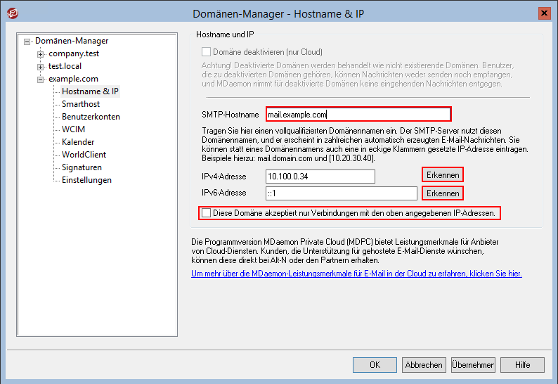 8. Soll die Zusatz-Domäne an eine bestimmte Adresse gebunden werden, setzen Sie den Haken bei Diese Domäne akzeptiert nur Verbindungen in den oben angegebenen IP-Adressen..