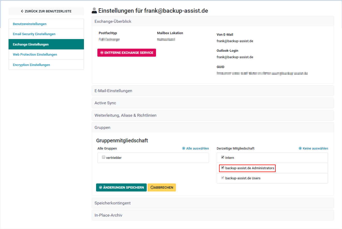 Hierzu ist es erforderlich, dass der Benutzer in der "Benutzerverwaltung" unter "Exchange Einstellungen" und "Gruppen" der Gruppe "Administratoren" angehört.