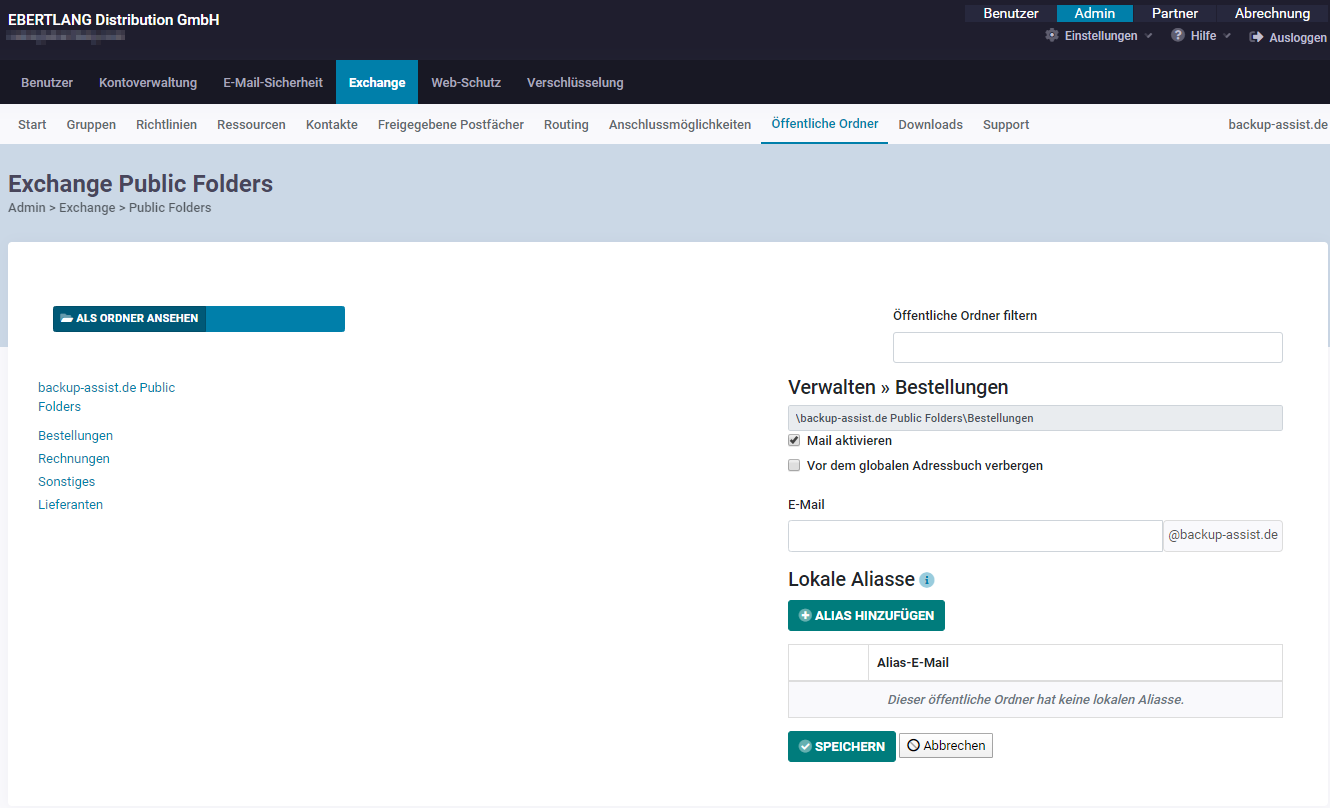 Im Kundenportal unter dem Bereich "Admin" im Reiter "Exchange" können Sie wiederum unter "Öffentliche Ordner" die Bereitstellung der öffentlichen Ordner aktivieren. Die eigentliche Erstellung der Ordner erfolgt in Outlook auf der Arbeitsstation.