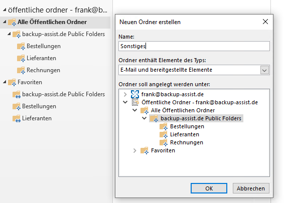 Der Benutzer kann nun in Outlook über die Ordnerliste öffentliche Ordner erstellen: