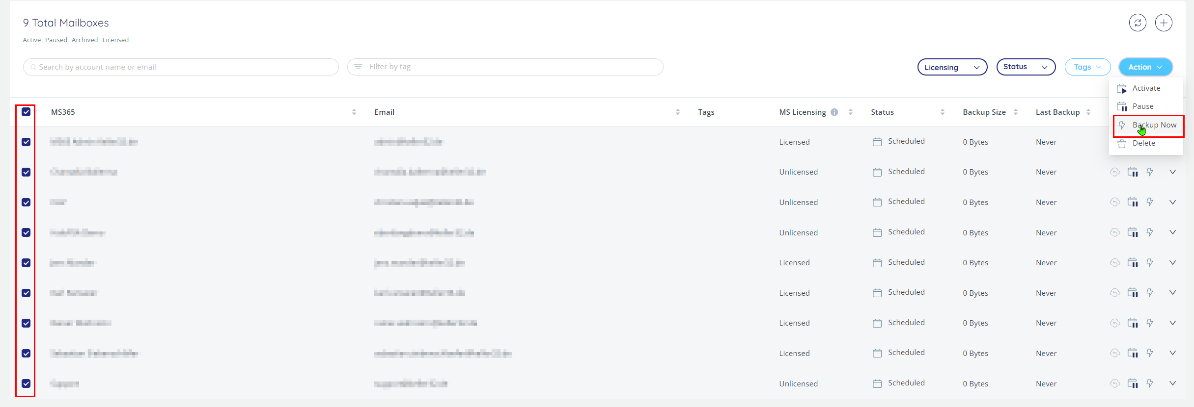 Wenn Sie möchten, dass unmittelbar nach der Aktivierung auch direkt ein Backup gestartet wird, so können Sie dies auch manuell anstoßen. Dafür haken Sie wieder in der Liste der erkannten Benutzer alle an, für welche Sie Sicherungen aktivieren möchten und klicken auf den Button Action → Backup Now.