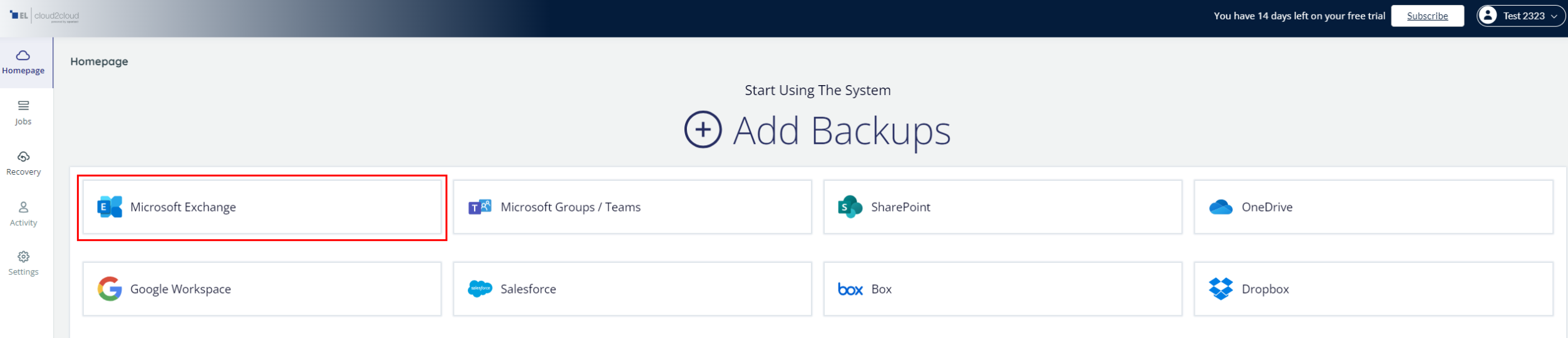 Hier können Sie ebenfalls auf den Button „Microsoft Exchange“ klicken, um einen neuen Backupjob für Ihren Exchange Online-Server einzurichten. Es erscheint hier ebenfalls ein Pop-Up, um dem Backupjob einen Namen zu geben und anschließend eine Authentifizierung via OAuth durchzuführen.