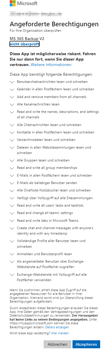 Bei der Authentifizierung müssen verschiedene Berechtigungen, welche EL cloud2cloud für die Erstellung der Sicherungen benötigt, von Ihnen erteilt werden.