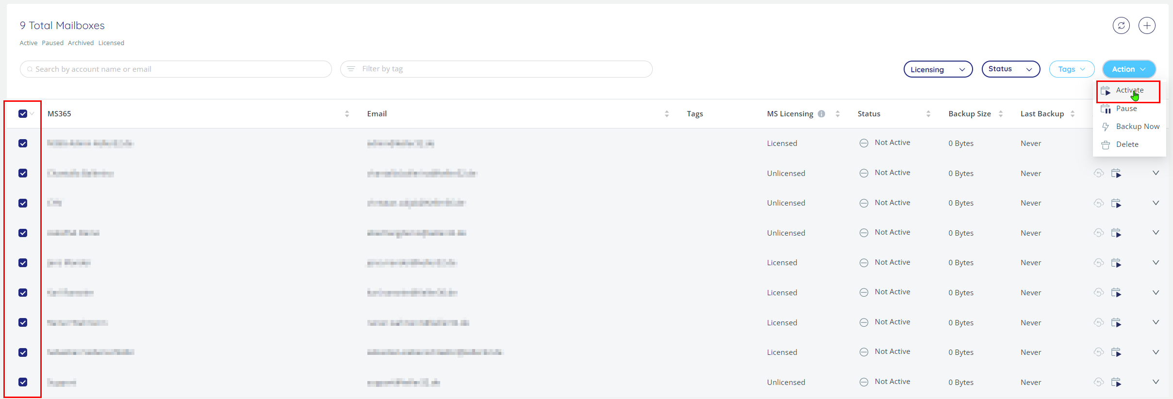 Nachdem Sie Ihre Backup-Einstellungen hinterlegt haben, müssen Sie als nächstes den Backupjob an sich für die gewünschten Benutzer aktivieren. Dafür haken Sie in der Liste der erkannten Benutzer all diejenigen an, welche Sie sichern möchten und klicken im Anschluss in der oberen rechten Ecke auf den Button Action → Activate. In unserem Beispiel haben wir für alle Benutzer die Sicherung aktiviert.