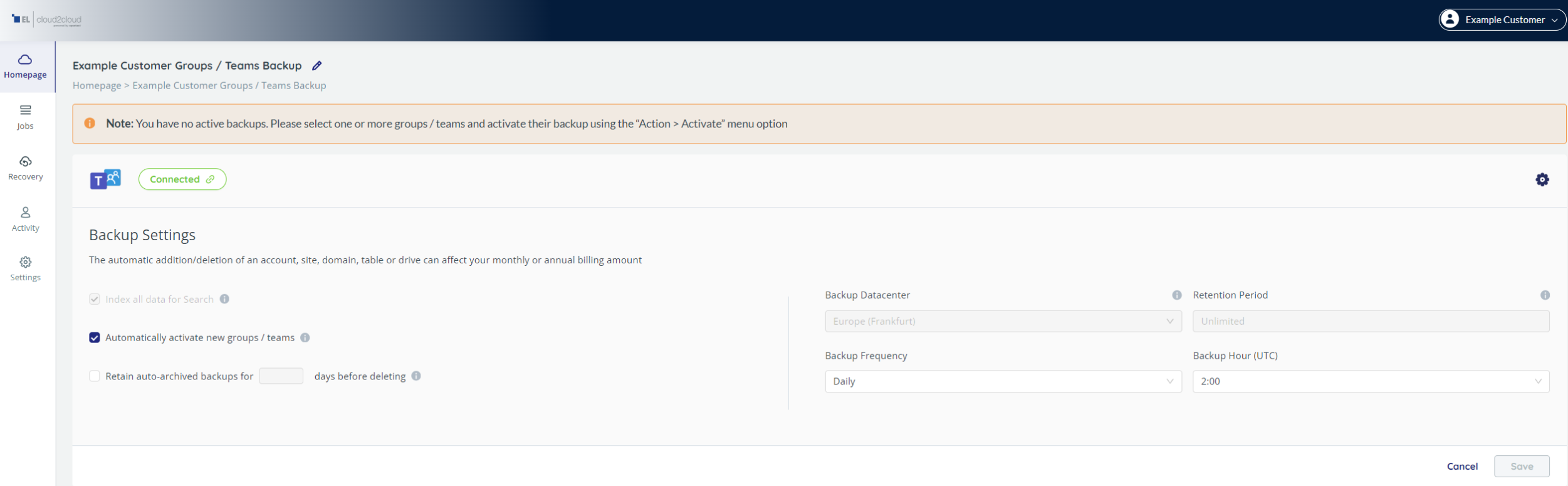- Automatically activate new groups / teams – Die standardisiert aktivierte Option bewirkt, dass automatisch neu erkannte Microsoft Groups / Sites mit in die Sicherung aufgenommen werden.