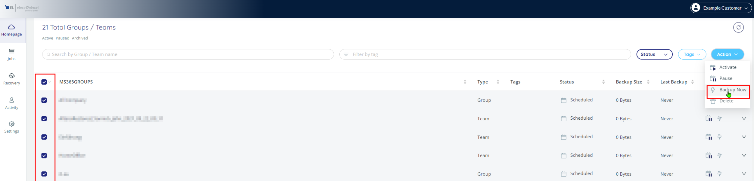 Wenn Sie möchten, dass unmittelbar nach der Aktivierung auch direkt ein Backup gestartet wird, so können Sie dies auch manuell anstoßen. Dafür haken Sie wieder in der Liste der erkannten Groups/Teams all solche an, für welche Sie die Sicherung sofort aktivieren möchten und klicken wieder auf den Button Action → Backup Now.