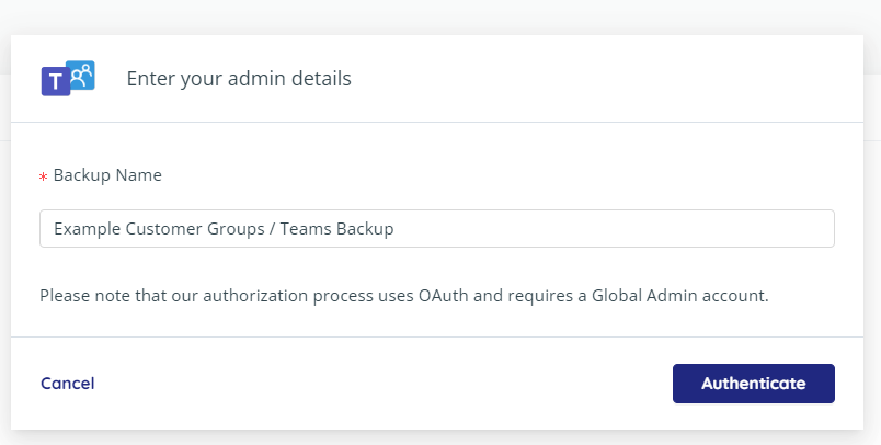 Nachdem Sie auf den Button „Microsoft Groups / Teams“ klicken, steht Ihnen im Anschluss über ein Pop-up direkt die Möglichkeit zur Verfügung, dem Backupjob einen Namen zu geben und sich anschließend via OAUTH-basierten Authentifizierungsverfahren mit einem Microsoft-Benutzer mit administrativen Berechtigungen am gewünschten Tennant zu authentifizieren.