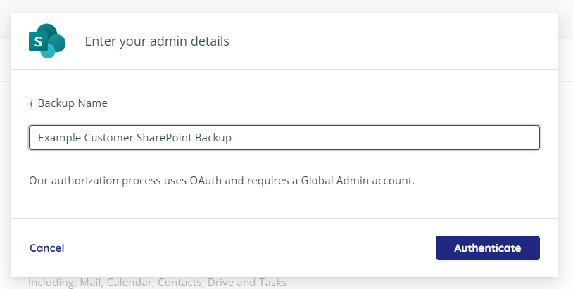 Hier können Sie ebenfalls auf den Button „Microsoft SharePoint“ klicken, um einen neuen Backupjob für Ihre Microsoft SharePoint-Umgebung einzurichten. Es erscheint hier ebenfalls ein Pop-up, um dem Backupjob einen Namen zu geben und anschließend eine Authentifizierung via OAuth durchzuführen.