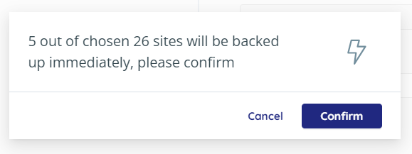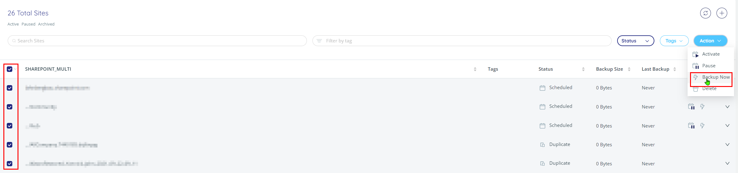 Wenn Sie möchten, dass unmittelbar nach der Aktivierung auch direkt ein Backup gestartet wird, so können Sie dies manuell anstoßen. Dafür haken Sie wieder in der Liste der erkannten Sites all solche, für die Sie die Sicherung aktivieren möchten und klicken auf den Button Action → Backup Now.