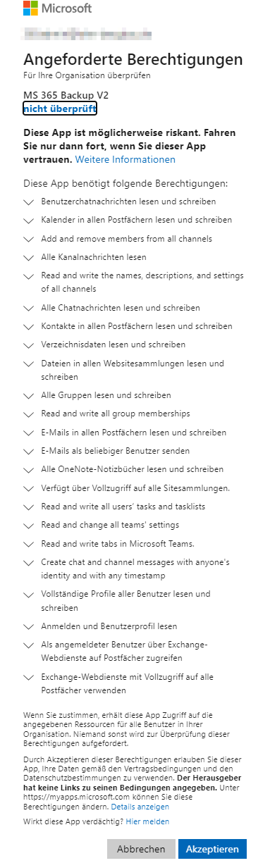 Bei der Authentifizierung müssen verschiedene Berechtigungen, welche EL cloud2cloud für die Erstellung der Sicherungen benötigt, von Ihnen erteilt werden.