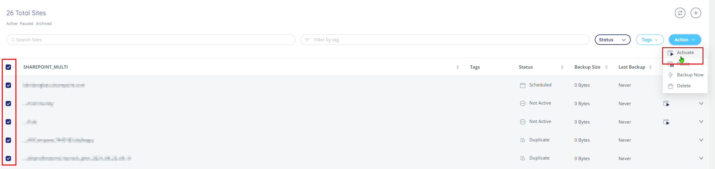 Nachdem Sie Ihre Backup-Einstellungen hinterlegt haben, müssen Sie als nächstes den Backupjob an sich für die gewünschten Sites aktivieren. Dafür haken Sie in der Liste der erkannten Sites all diejenigen an, welche Sie sichern möchten und klicken im Anschluss in der oberen rechten Ecke auf den Button Action → Activate. In unserem Beispiel haben wir für alle Sites die Sicherung aktiviert.