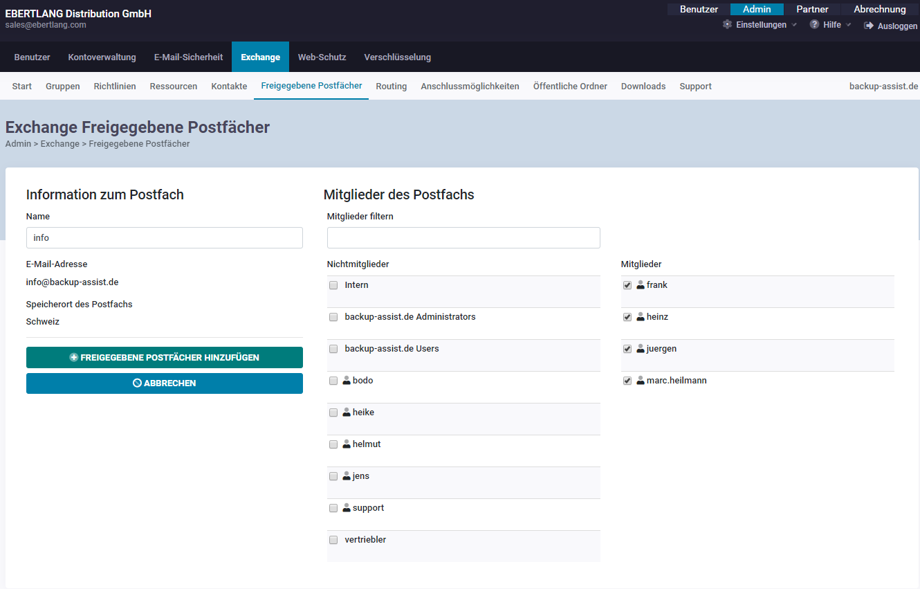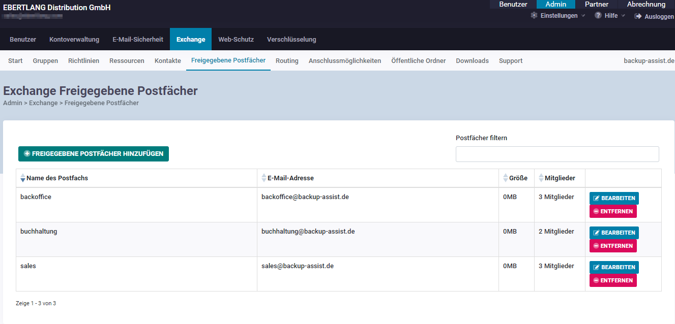 Im Kundenportal im Bereich "Admin" im Reiter "Exchange" können Sie unter "Freigegebene Postfächer" die Bereitstellung der freigegebenen Ordner konfigurieren.