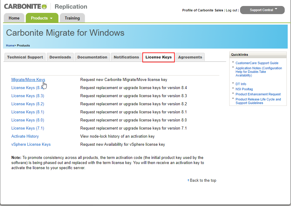 Hier wählen Sie den Reiter "License Keys" und gehen auf "Migrate/Move Keys"