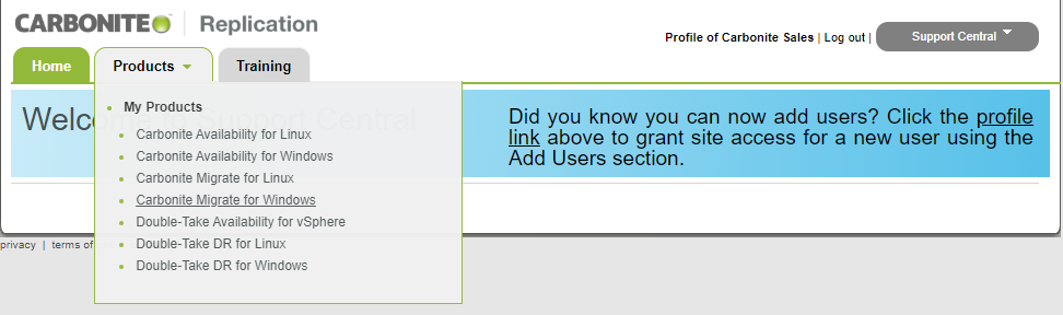 Nach der Anmeldung gehen Sie nun auf Products → Carbonite Migrate for Windows/Linux