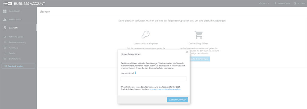 Bevor Sie eine ESET PROTECT-Cloudinstanz einrichten können, benötigen Sie eine entsprechende Lizenz. Bei Laufzeit-Lizenzen benötigen Sie einen ESET-Business-Account. Diesen können Sie unter https://eba.eset.com erstellen. Sobald Sie eingeloggt sind, wird die Lizenz folgendermassen eintragen: „Lizenzen“ -> „Lizenzschlüssel eingeben“ -> „Lizenz hinzufügen“.