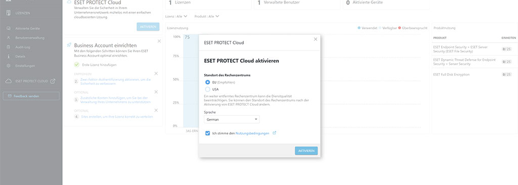 Nachdem die Lizenz eingetragen wurde, wird im Dashboard die neue ESET PROTECT-Cloudinstanz aktiviert. Wählen Sie den Standort für das Rechenzentrum und die gewünschte Sprache aus.
