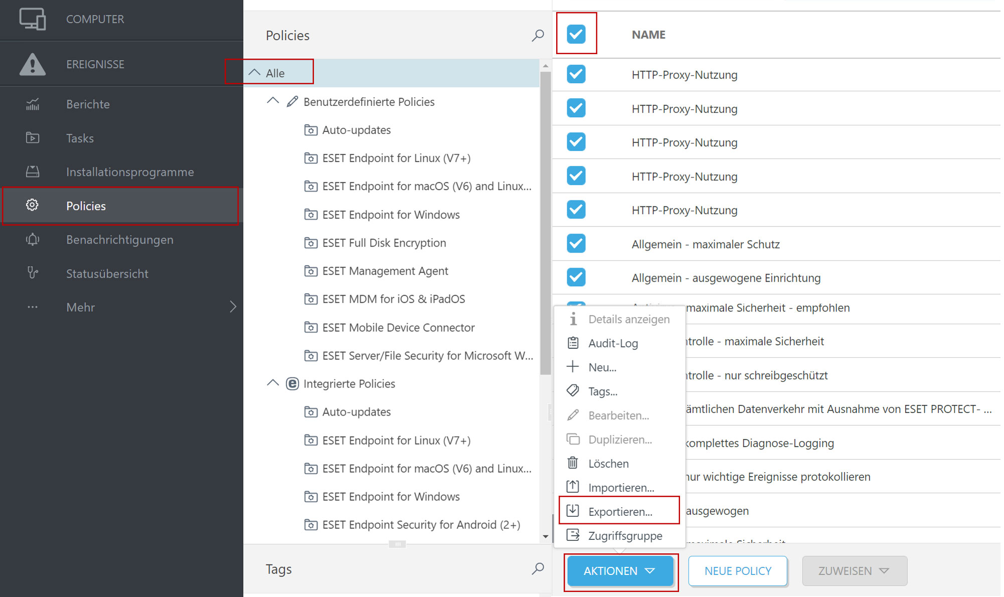 Wählen Sie „Policies“ -> „Alle“ aus. Markieren Sie anschließend die zu übernehmenden Policies. Mit „Aktionen“ -> „Exportieren“ exportieren Sie die Richtlinien.