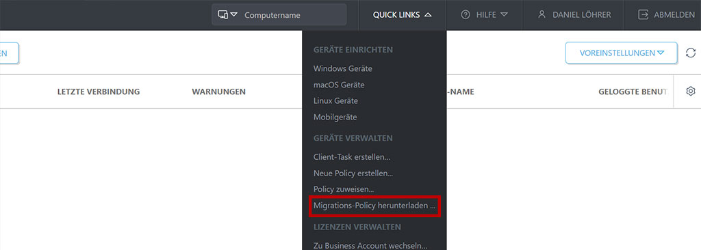 Laden Sie in der ESET PROTECT Cloud-Web-Konsole unter „Quick Links“ die Migrations-Policy herunter: