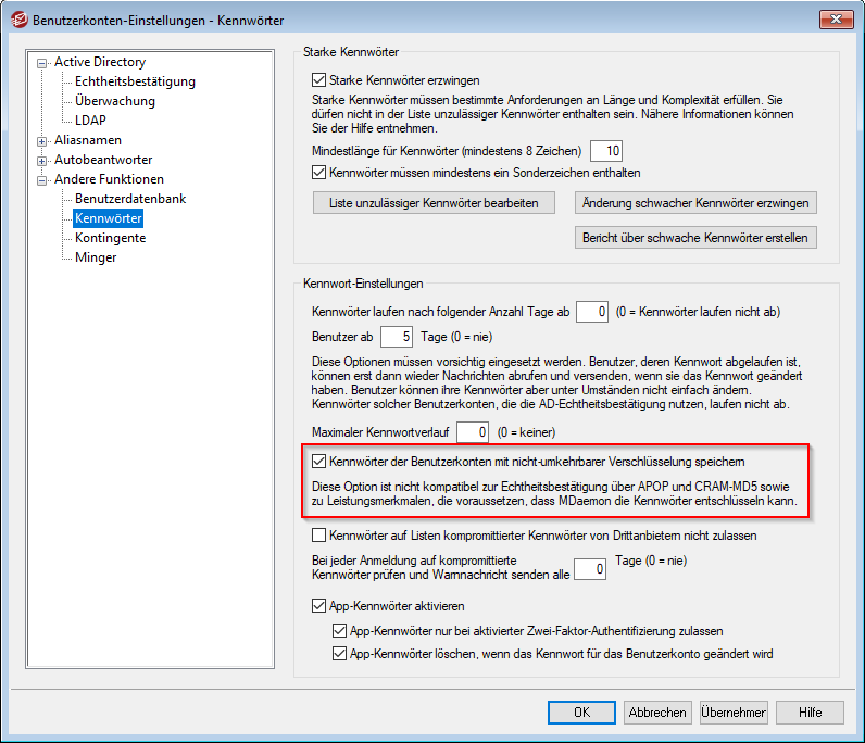 Öffnen Sie in MDaemon das Menü Benutzerkonten → Benutzerkonten-Einstellungen → Andere Funktionen → Kennwörter. Aktivieren Sie die Option "Kennwörter der Benutzerkonten mit nicht-umkehrbarer Verschlüsselung speichern".