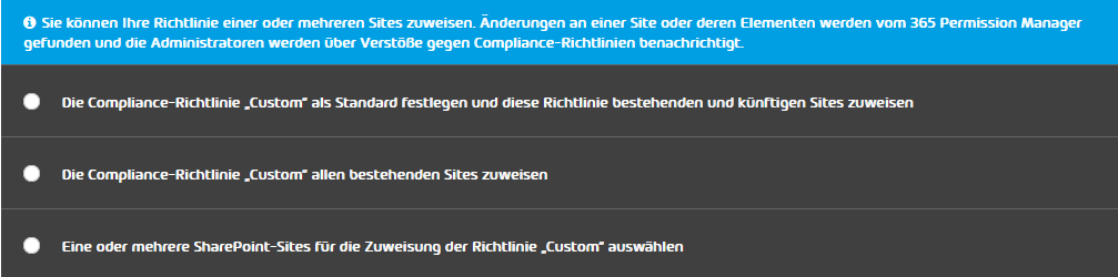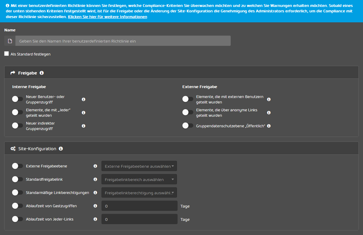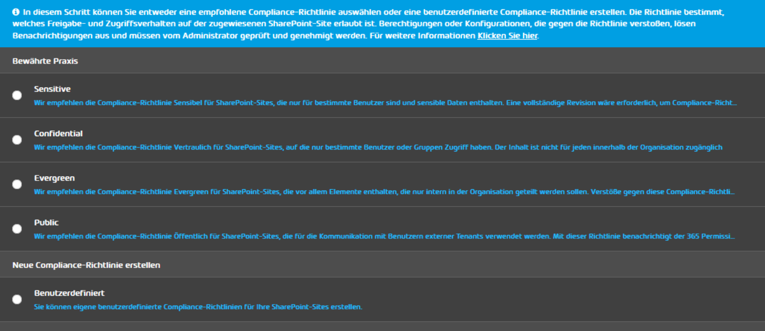 Schließen Sie die Ersteinrichtung mit „Weiter“ ab. Nun können Sie auswählen, welche Compliance-Richtlinie Sie für die Organisation anwenden wollen. Sie entscheiden zwischen einer der vier vordefinierten Richtlinien oder einer manuell erstellten Richtlinie. Unter diesem Link finden Sie detaillierte Erläuterungen, was welche Richtlinie bedeutet. Diese Richtlinien sind Vorgaben, die ausgewählte Sites erfüllen müssen. Wenn eine Site später gegen die Vorgaben einer Richtlinie verstößt, können Sie als Administrator entscheiden, ob der Verstoß geduldet wird oder behoben werden soll.