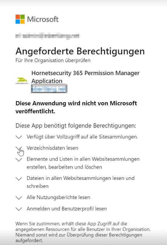 Im letzten Schritt genehmigen Sie dem Permission Manager die Berechtigung zum Einsehen von SharePoint-Sites und OneDrive-Konten.