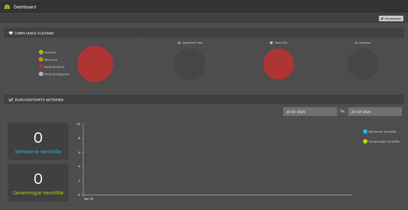 Sobald die Konfiguration abgeschlossen ist, haben Sie die Möglichkeit über das Dashboard einzusehen, wenn eine Site nicht konform der festgelegten Richtlinie agiert.