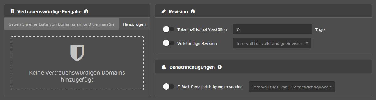 Sie haben zusätzlich die Möglichkeit, vertrauenswürdige Domains für Freigaben zu hinterlegen und die Revisionseinstellungen (Überprüfung) sowie die Benachrichtigungseinstellungen anzupassen.