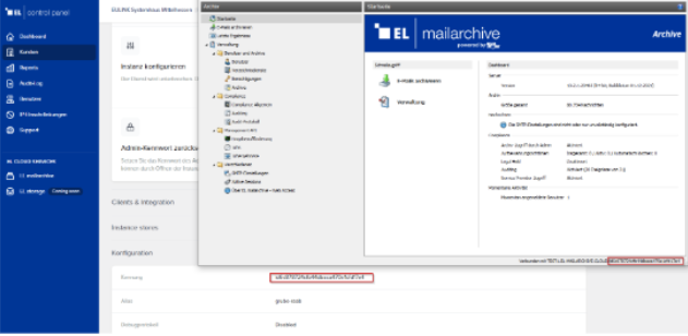 - Wie lautet die im EL Control Panel eingerichtete „Kennung“? Dies ist die interne eindeutige Instanznummer. Diese finden Sie in den Instanz-Einstellungen des Kunden unter „Konfiguration“ → „Kennung“ oder im EL mailarchive-Client unten rechts.