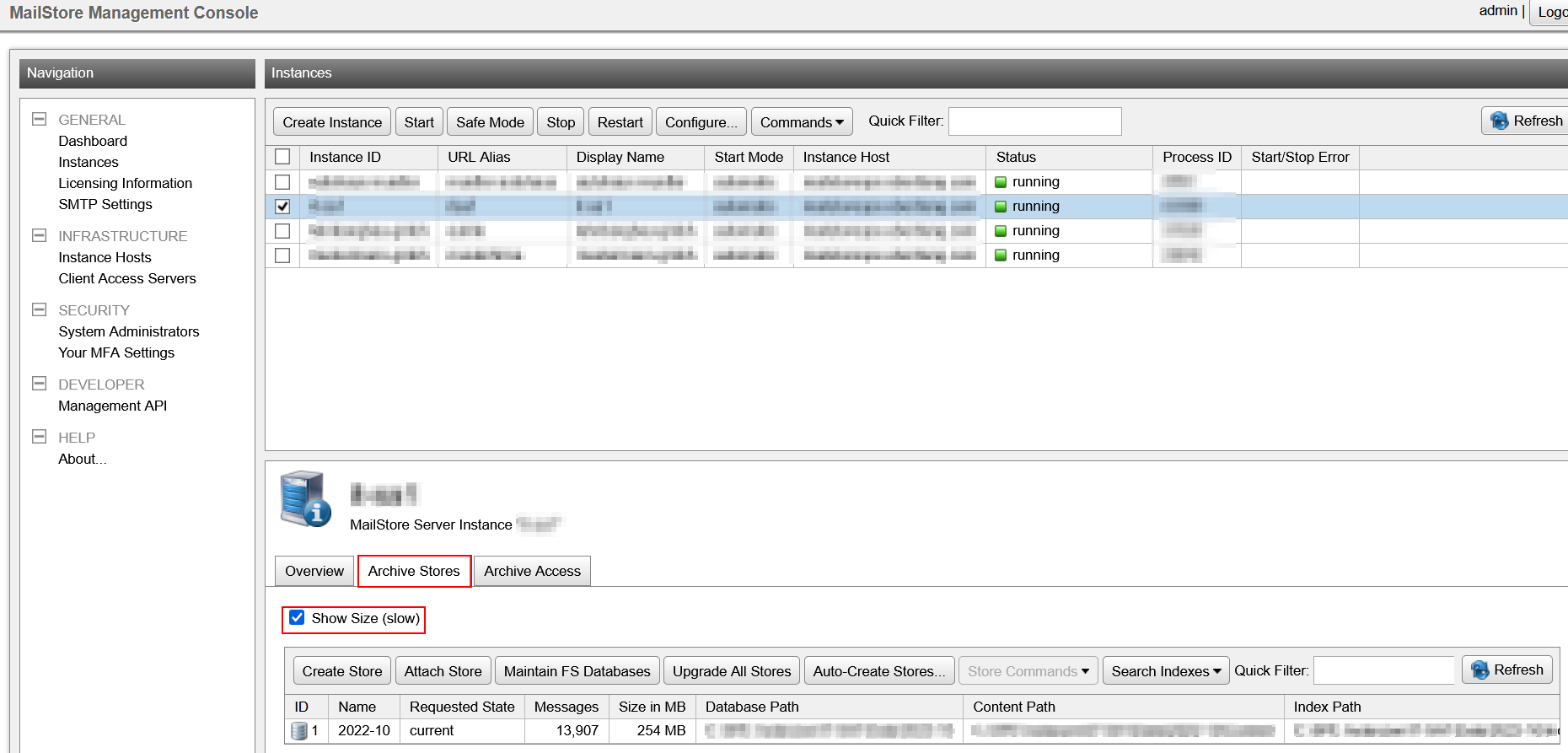 Wie viele Archivspeicher und E-Mails sind das, wie groß sind die Archivspeicher (GB)? Um eine Übersicht der Archivspeicher zu bekommen, melden Sie sich an der MailStore Management Console an, wählen die zu migrierende Instanz aus, klicken im Info-Bereich auf Archive Stores und setzen den Haken bei Show Size (slow). Erstellen Sie einen Screenshot der Archivspeicher-Übersicht, den Sie uns bitte zukommen lassen.