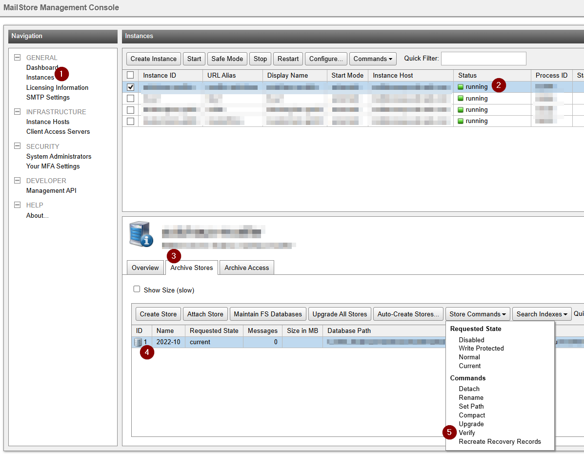 Bitte führen Sie eine Datenintegritätsprüfung aller zu übertragenden Archivspeicher durch. Dies gewährleistet, dass die Daten fehlerfrei in EL mailarchive eingebunden werden können. Dazu melden Sie sich an der MailStore Management Console an, wählen die zu migrierende Instanz aus, klicken im Info-Bereich auf Archive Stores und markieren einen Archivspeicher. Über das Dropdown-Menü Store Commands können Sie dann die Funktion Verify auswählen.