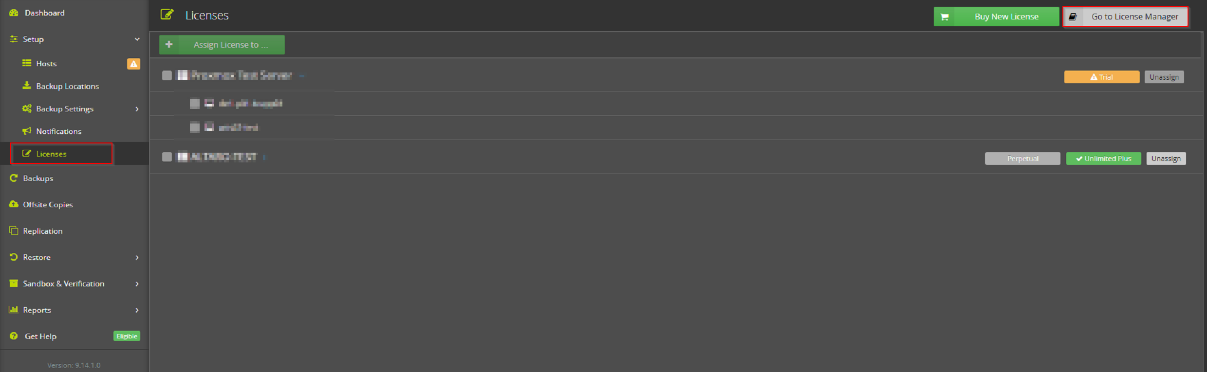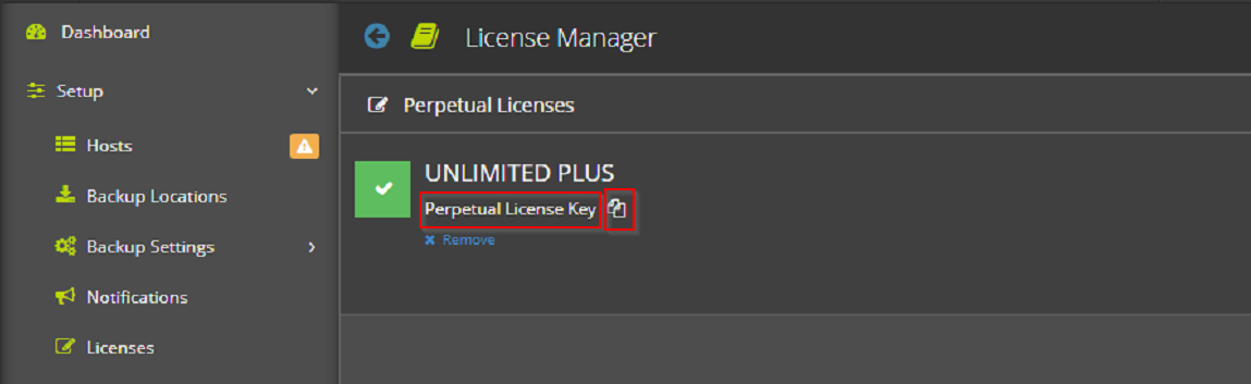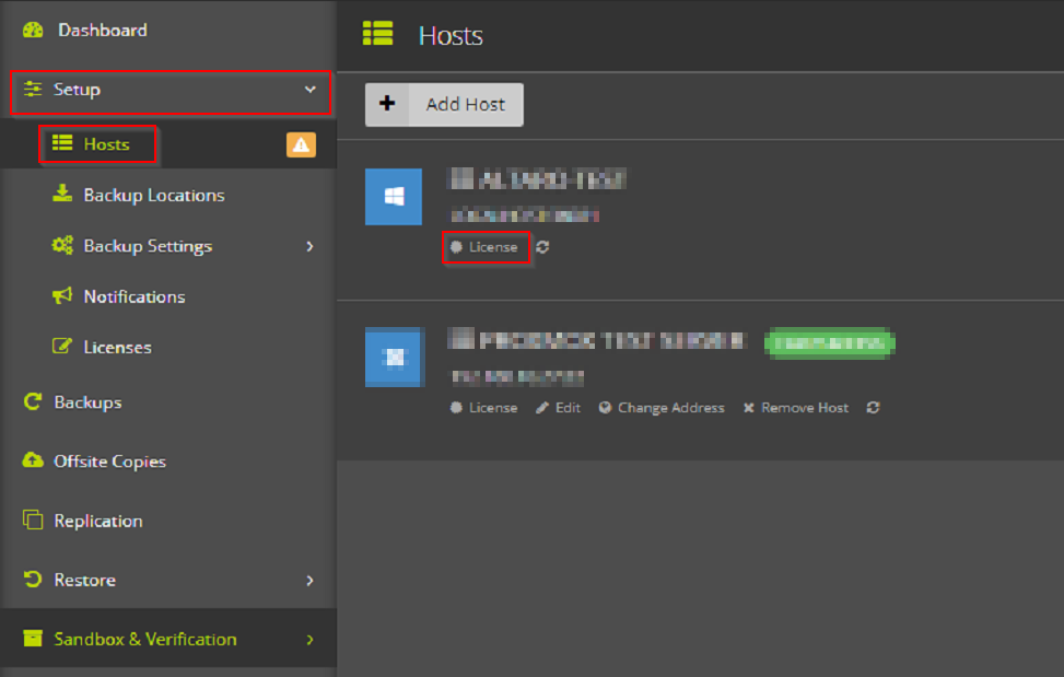 Sobald Sie Altaro VM Backup und das zugehörige Dashboard geöffnet haben, finden Sie die Informationen zur Lizenz unter "Setup → Hosts → License".