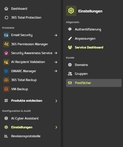 Gehen Sie in der linken Navigationsleiste zu Kundeneinstellungen → Postfächer