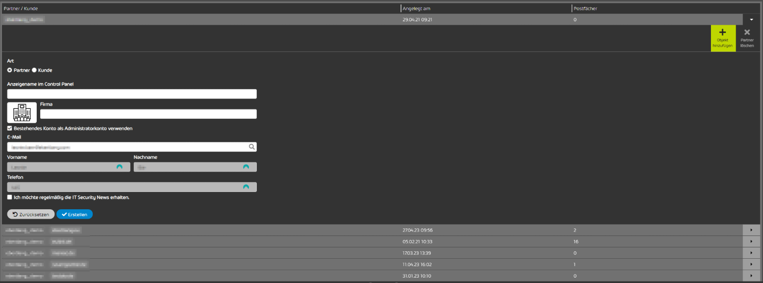 Wählen Sie oben rechts in der Bereichsauswahl die eigene Partnerumgebung "KUNDENNUMMER_FIRMENNAME" aus